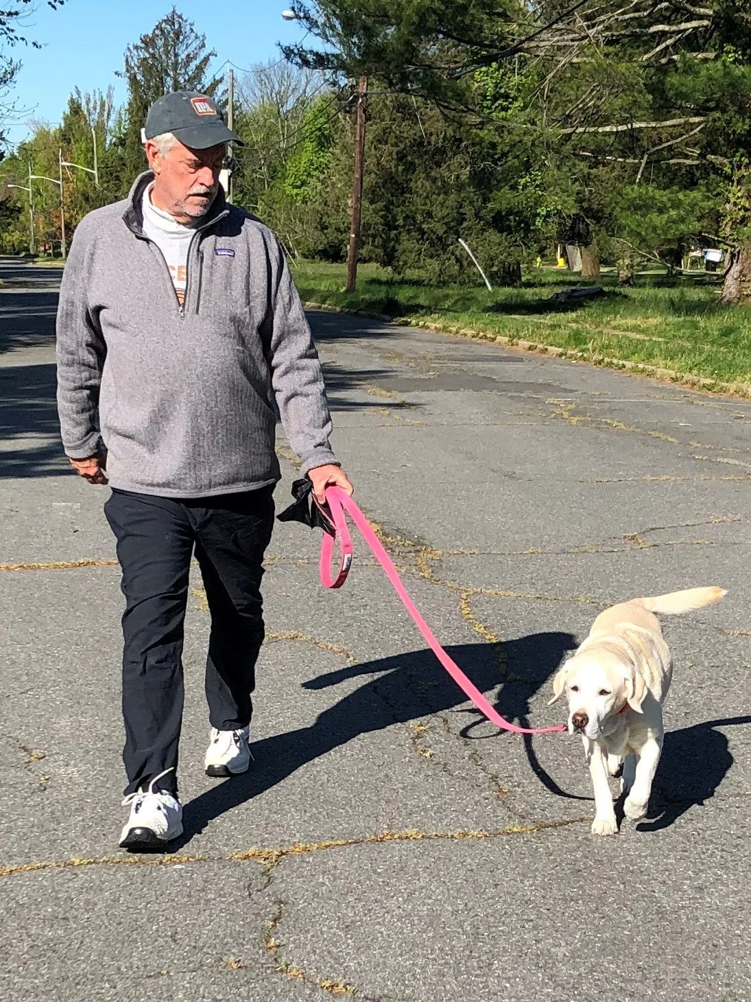 Become the walked. Whenever the leash describes a gentle inverted parabola, the dog is walking you.
